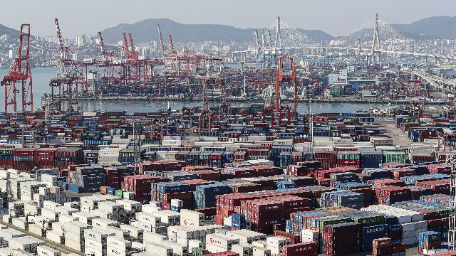 사진은 부산항 신선대부두에 수출입 컨테이너가 가득 쌓여 있는 모습. 부산일보DB