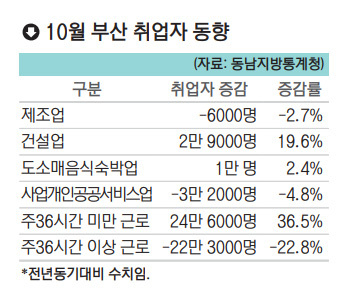 10월 부산의 취업자가 제조업은 줄어들고 건설업 분야에서 크게 늘어났다. 또 주36시간 미만 취업자는 급증했고 36시간 이상 취업자는 크게 줄어들었다.