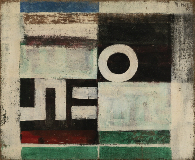 마대 천에 직사각형과 원형, 기하학적인 도형들을 화면 전면을 채우듯 배치한 것으로 보아 당시 작가가 대상의 단순화를 지속적으로 꾀하였음을 추측할 수 있다. 그가 구성한 화면을 통한 선과 색, 면 같은 기본적인 요소들의 감각적인 배열을 감상해 볼 것을 권한다. 한묵의 색채와 움직임에 대한 감각이 만들어낸 기하 추상의 다양한 변주들은 평면의 구성이지만, 역동성과 입체감을 불러일으키기에 충분하다.