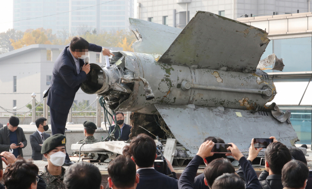 9일 국방부에서 국방부 산하 연구원 관계자가 북한 미사일 잔해물 추정 물체에 대해 설명하고 있다. 북한은 지난 2일 동해 북방한계선 이남으로 해당 미사일을 발사했다. 연합뉴스