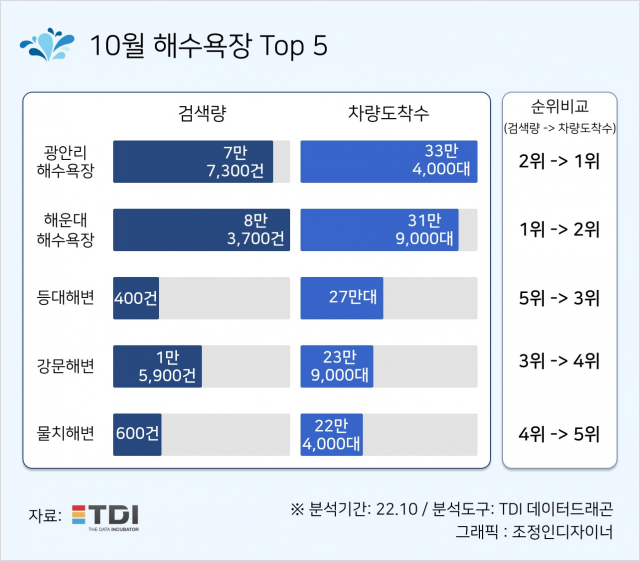 그 결과, 검색량에서는 해운대 해수욕장이, 차량 도착수에서는 광안리 해수욕장이 각각 선두를 차지했다.