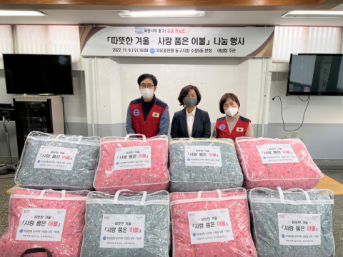 부산 동구(구청장 김진홍) 자유총연맹 수정5동 분회(회장 김운태)· 여성회(회장 김태향)는 9일, '따뜻한 겨울-사랑 품은 이불' 나눔 행사를 개최하여 관내 저소득 어르신 등 취약계층 15세대(환가액 700,000원)에 따뜻한 겨울 이불을 전달하며 이웃과의 정을 함께 했다.