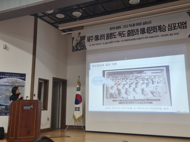 지난 10일 경상북도 울릉도·독도해양연구기지에서 열린 '제주 해녀의 울릉도·독도 출향과 해녀 문화 계승' 심포지엄에서 독도재단 김수희 교육연구부장이 발표를 하고 있다.