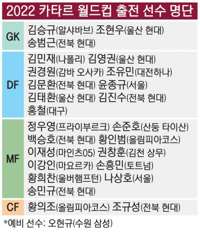 최전방 공격수에는 황의조(올림피아코스)와 올 시즌 K리그1 득점왕인 조규성(전북)이 나선다. 벤투 감독은 11일 열린 아이슬란드와의 최종 평가전(1-0 승)에서 도움을 기록한 조규성의 활발한 움직임을 높이 평가했다. 한편으로 최근 소속팀에서 부진한 모습을 보이는 황의조가 월드컵에서 예전의 폭발력을 되찾길 간절히 기대하고 있다. 골키퍼에는 ‘붙박이 수문장’ 김승규(알샤바브)와 조현우(울산), 송범근(전북)이 장갑을 낀다.