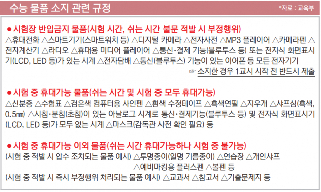 시험장에는 휴대전화와 스마트워치, 블루투스 기능이 있는 이어폰, 태블릿PC 등 모든 전자기기를 들고 들어갈 수 없다. 부득이하게 전자기기를 가지고 온 경우 1교시 시작 전에 감독관의 지시에 따라 제출해야 하며, 제출하지 않고 적발되면 부정행위로 간주돼 ‘시험 무효’ 처리된다. 시계는 통신·결제 기능(블루투스 등)이나 전자식 화면표시기(LCD·LED 등)가 모두 없는 아날로그 시계만 쓸 수 있다.