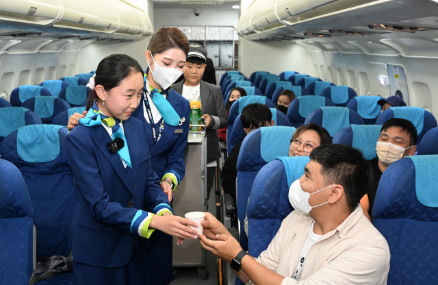 14일 부산 강서구 에어부산 사옥에서 열린 몽골인 근로자 자녀 초청 행사에 참여한 몽골 국적 어린이들이 일일 승무원 체험을 하며 기내 서비스를 배우고 있다. 이재찬 기자 chan@