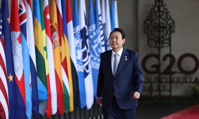 윤석열 대통령이 15일(현지시간) 인도네시아 발리 캠핀스키호텔에서 열린 주요 20개국(G20) 정상회의에 참석하기 위해 회의장 인근 만국기 앞을 지나고 있다. 연합뉴스