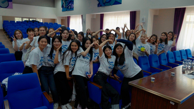 부산에서 출발한 유라시아 대장정 단원들이 9월 16일 카자흐스탄 알마티시 국제관계세계언어대에서 이 대학 동양학과 한국어전공 학생들과 교류 행사를 갖고 있다. 부산일보DB