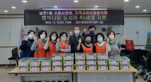 부산광역시 수영구 남천1동 행정복지센터(동장 김기준)는 지난 15일 남천1동 지역사회보장협의체(위원장 김복돌) 및 수영사랑회(회장 이혜경)에서 지역 내 어려운 복지취약계층 어르신을 대상으로 정성을 다해 손수 담근 '동절기 맞이 행복나눔 동치미 지원 사업'을 추진했다고 밝혔다.