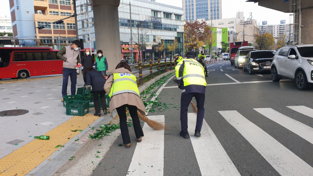 17일 오전 7시 42분 수능 수험장인 부산 연제구 이사벨고 정문 앞에서 술병을 운반하는 화물차에서 적재물이 쏟아져 유리조각이 도로 위로 쏟아졌다. 경찰은 즉시 수거 조치했고 운전자에게 과태료를 부과했다. 부산경찰청 제공