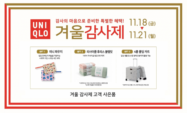 △글로벌 패션 브랜드 유니클로(UNIQLO)가 21일까지 '유니클로 겨울 감사제'를 실시한다. 고객에게 감사의 마음을 전달하기 위해 매 시즌 베스트셀링 제품을 특가에 선보이는 연중 최대 규모의 고객 사은 행사다. 전국 유니클로 매장과 온라인 스토어에서 진행되는 감사제에는 겨울철 필수 아이템인 남녀, 키즈 히트텍 이너웨어·히트텍 액세서리와 양말 등 다양한 히트텍 라인업 제품이 할인된 가격으로 제공된다. 아우터·이너로 활용 가능한 '남성용 울트라 라이트 다운 컴팩트 베스트'는 정가 대비 1만 원, 여유 있는 실루엣과 편안한 착용감의 '여성용 울트라 라이트 다운 릴렉스 재킷'은 정가대비 2만 원 할인된 가격에 만나볼 수 있다. 올해 국내 처음으로 출시된 키즈 '울트라 라이트 다운 베스트'·'울트라 라이트 다운 파카'를 정가 대비 각각 1만 원 할인된 가격으로 구매할 수 있다. 사회적 나눔을 실천하기 위한 일환으로 발달장애인 아티스트의 육성·창작 활동을 지원하는 사회적기업인 '스프링샤인'과의 협업 하에 발달장애인 아티스트의 일러스트가 담긴 '미니 파우치'를 겨울 감사제 기간 동안 모든 구매 고객에게 선착순으로 증정한다. 감사제 기간 동안 10만 원 이상 구매한 고객에게 리사이클 후리스 블랭킷을, 30만 원 이상 구매한 고객에게는 일상에서 유용하게 활용할 수 있는 폴딩 카트를 선착순으로 제공한다.