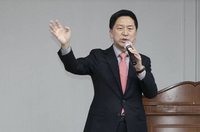 김기현 국회의원이 지난 18일 부산일보사 대강당에서 ‘조직을 빛나게 할 리더십’을 주제로 강연을 하고 있다. 이날 행사는 포럼 ‘민생의 힘’ 주최로 열렸다. 정대현 기자 jhyun@