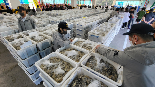 지난달 24일 경남 통영 굴수협에서 열린 ‘2022년 생굴 초매식’에서 경매사들이 경매에 나온 생굴의 상태를 점검하고 있다. 김민진 기자 mjkim@