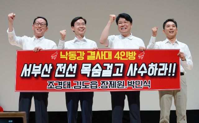 사진은 김도읍(왼쪽부터), 조경태, 장제원 의원과 박민식 보훈처장이 지난 2019년 6월 15일 부산 북구 빙상경기장에서 열린 당원교육에서 ‘낙동강 결사대’ 발족 모습. 부산일보DB
