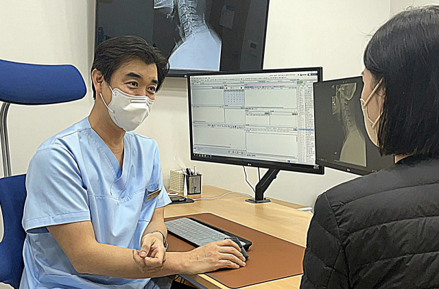 김운성 원장이 환자의 엑스레이 검사 결과를 토대로 목 통증의 원인과 치료법에 대해 설명하고 있다. 팔도마취통증의학과의원 제공