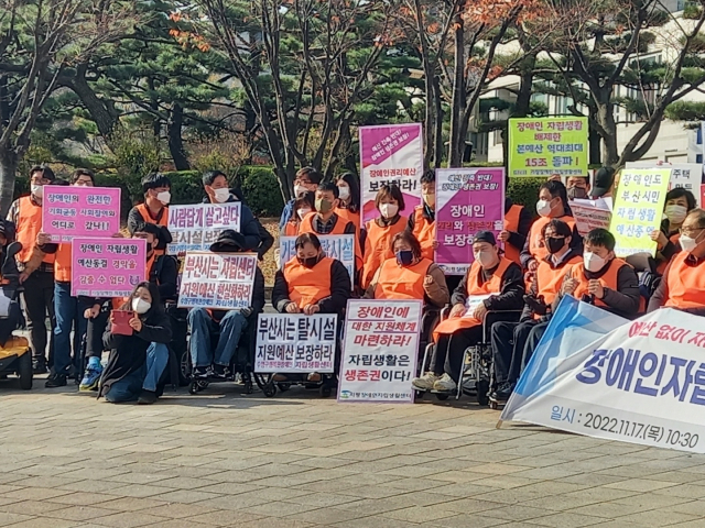부산시가 내년도 본예산을 15조 원이 넘는 역대 최대 규모로 편성하면서 오히려 사회적 약자인 장애인 지원 예산은 줄줄이 깎아 장애인들의 불만이 비등하다. 17일 부산시청 앞 시민광장에서 부산장애인자립생활센터총연합회가 부산시에 장애인자립생활예산 확보를 요구했다. 부산장애인자립생활센터총연합회 제공