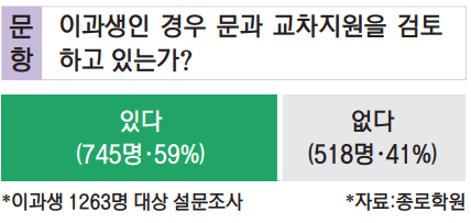 21일 종로학원에 따르면 종로학원이 이달 4일부터 16일까지 고3 수험생, 재수생, 반수생 등 이공계 수험생들 1263명을 대상으로 인문계 학과 교차지원 의사를 묻는 설문조사를 실시한 결과, 응답자의 59%(745명)가 문과 교차지원을 ‘검토 중’이라고 답했다.