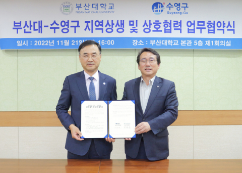부산대학교(총장 차정인)는 부산 수영구(구청장 강성태)와 지역인재 육성 및 경제 활성화, 교육·문화수준 향상을 위한 '상호협력 업무협약'을 21일 오후 교내 대학본부 5층 제1회의실에서 체결했다고 22일 밝혔다.