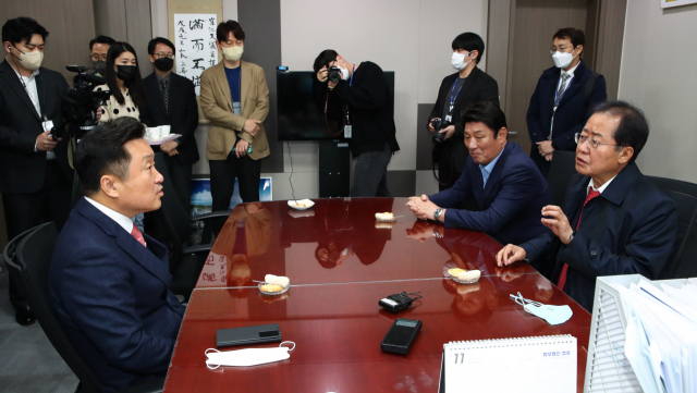 홍준표 대구시장이 대구경북통합신공항 특별법과 관련해 22일 국회 의원회관을 찾아 더불어민주당 최인호 의원(국토교통위원회 간사)과 대화하고 있다. 김종호 기자 kimjh@