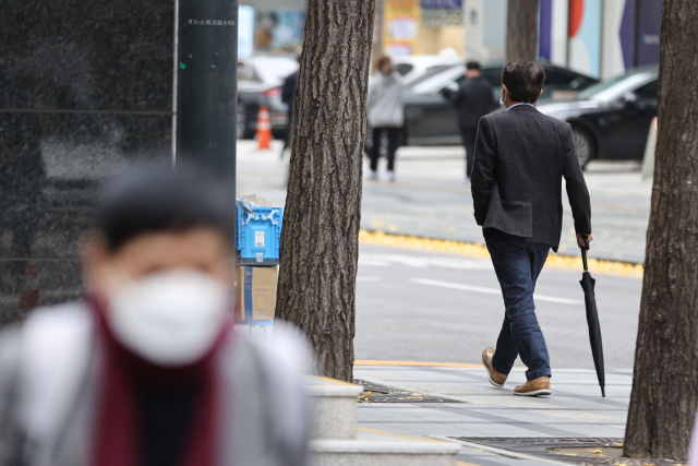 절기상 소설(小雪)인 22일 오후 서울 중구 서울광장 인근에서 한 시민이 우산을 들고 걷고 있다. 연합뉴스