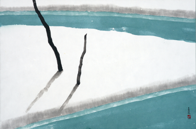 ‘경계에 서다’ 시리즈는 표현과 비표현의 경계를 이용해 화면에 생명력을 불어넣은 작업이다. 겨울날 헐벗은 나뭇가지와 쓸쓸한 강물의 이미지가 소복이 쌓인 눈을 도드라지게 만든다. 하지만 그림 속 눈은 아무것도 칠하지 않고 비워둔 여백, 종이 그 자체이다. “(일부러) 눈처럼 표현한 것인지, 그냥 비워둔 것인지. 대상을 나타내고 또 나타내지 않는 것 속에서 어떤 대상이 발견되도록 하고 싶었어요.” 의도적 비움은 때로는 눈이 되고, 때로는 물이 된다.