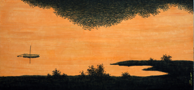전시에서 물에 비친 이미지를 많이 볼 수 있는 것도 같은 이유다. “요즘 메타버스 등 가상 세계 이야기를 많이 하잖아요. 물에 비친 것을 통해 ‘현실 속에 존재하는 가상’을 그림에서도 느낄 수 있도록 했죠.” 물에 비친 산을 그린 ‘산그림자’ 시리즈는 작가가 예전부터 해오던 작업. “이번에는 색을 넣어서 노을을 표현했죠. 바탕에 주홍빛을 칠하고 위에 먹을 올려, 저녁노을에 잠긴 강물과 하늘을 그렸어요.” 반짝이는 윤슬처럼 보이는 것은 흰색을 사용했는데, 주변이 노란색이라 은분처럼 보이는 것이라고 작가는 설명했다. “물고기가 뛰어오를 때 물방울이 튀는 그림에서는 먹에 운모를 섞어서 그려보기도 했어요.”