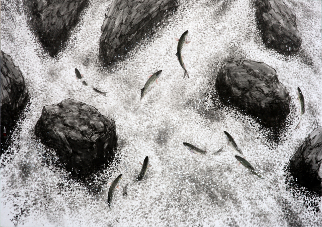‘관물청심’ 시리즈는 사물과 대화를 한다는 의미를 담고 있다. “관(觀)은 사물을 보면서 사물의 정수를 꿰뚫어 보고, 사물의 마음을 듣는다는 의미입니다. 어떤 뜻이나 마음을 사물에서 빌어오는 것으로, 소재나 내용은 전통을 가져오고 기법은 저의 기법을 사용했어요.” 이 작가는 물고기 숫자에 따라 의미하는 내용이 다르다고 했다. “물고기 아홉 마리가 등장하는 ‘구여도’는 아홉 구(九)와 오랠 구(久)가 같은 발음이라는 점에서 ‘선비의 여유가 오래도록 지속되라’는 뜻을 가져요. 송어를 그린 이유는 ‘회귀성 물고기’라는 생태적 특성을 반영한 것이죠.”