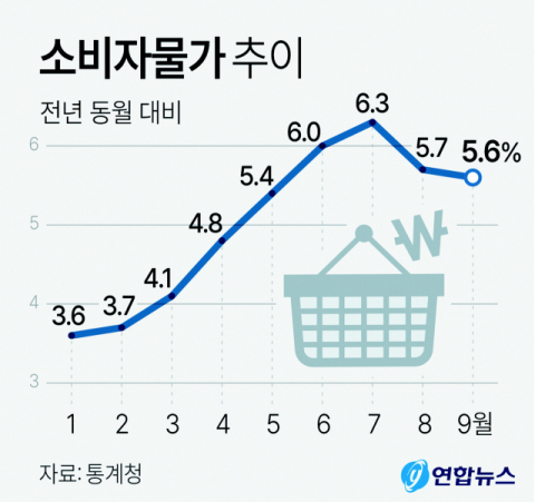 한은의 지속적인 기준금리 인상의 배경은 단연 물가 오름세다. 10월 소비자물가지수(109.21)는 작년 같은 달보다 5.7% 올랐다. 상승률이 7월(6.3%) 정점 이후 8월(5.7%), 9월(5.6%) 떨어지다가 석 달 만에 다시 높아졌다.