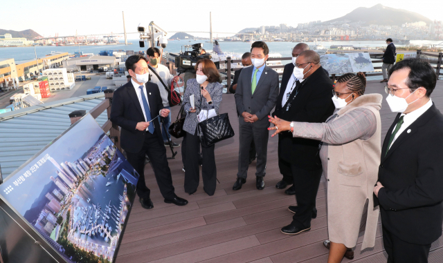 비상주 주한 아프리카 대사단 4명이 24일 부산 동구 북항재개발 홍보관을 방문해 부산시 관계자로부터 2030부산세계박람회 유치 계획과 준비 현황에 대한 설명을 듣고 있다.