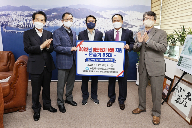 새마을금고 연합회(회장 김동주)는 지난 22일 저소득 취약계층을 위해 수영구청(구청장 강성태)에 990만 원 상당의 온풍기를 기탁했다.