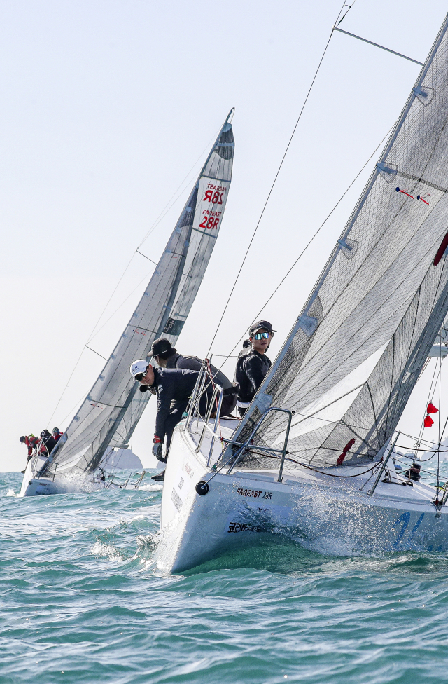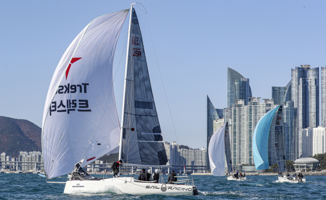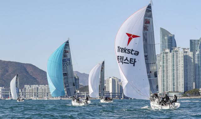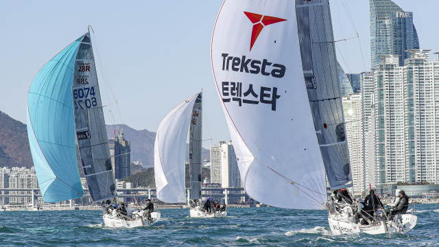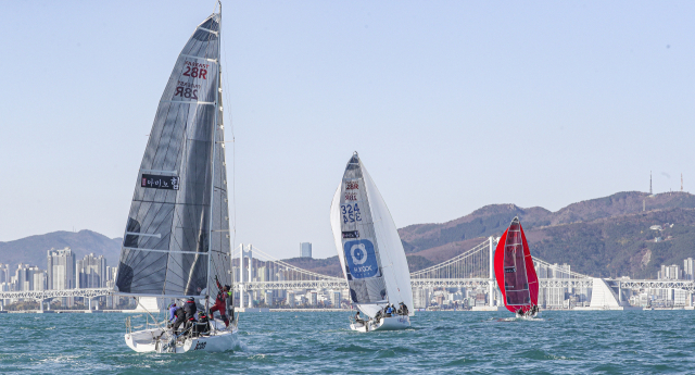 27일 부산 해운대구 수영만 요트경기장 인근에서 열린 ‘2022 코리아세일링 챔피언십’ 에 참가한 선수들이 힘찬 물살을 가르며 나아가고 있다. 24일부터 27일까지 나흘 동안 진행한 이번 대회는 요트 국가대표 하지민(해운대구청), 김근수(부안군청), 김지아(부산광역시청) 등 국내 최고 기량의 선수들이 대거 출전해 기량을 겨뤘다.