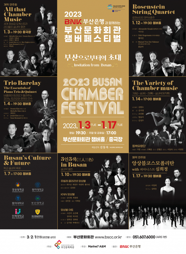 첫 공연은 세계 정상급 오케스트라 연주자가 참여하는 ‘2023 챔버 페스티벌-부산으로부터의 초대’로 시작된다. ‘실내악 대전 : 부산 밤하늘을 수놓다’라는 타이틀로 진행되며 내년 1월 부산문화회관 중극장과 챔버홀에서 7차례 공연을 연다. 3일 개막 공연에는 뉴욕필하모닉 부악장, BBC콘서트 오케스트라 첼로 수석, 퍼시픽 심포니 오케스트라 악장, 부산시립교향악단 악장 등이 무대에 오른다. 피아노 트리오와 퀸텟, 현악 4중주 등 새해 시작을 알리는 실내악 향연이 같은 달 4일, 7일, 10일, 12일, 14일, 17일까지 이어진다.