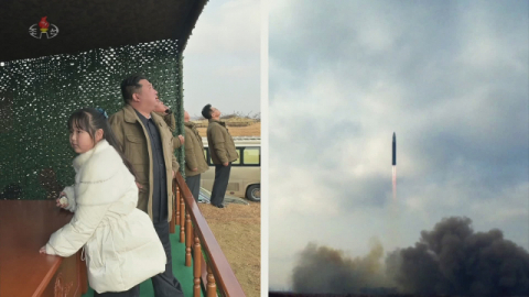 지난달 18일 북한 김정은 국무위원장이 딸과 함께 신형 ICBM ‘화성-17형’ 발사 모습을 지켜보고 있다. 연합뉴스