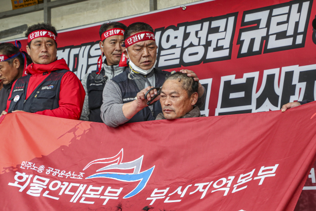 29일 부산 강서구 부산신항 삼거리에서 화물연대 부산본부 조합원들이 정부의 업무개시명령에 반발하는 집회를 열고 송천석 부산지역본부장이 삭발하고 있다. 김종진 기자 kjj1761@