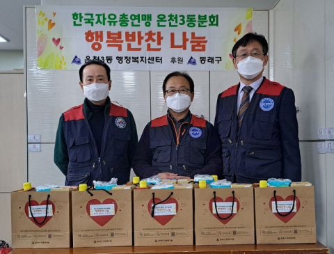 한국자유총연맹 온천3동분회(회장 이정재)는 24일 온천3동 행정복지센터에서 무의탁 어르신 및 어려운 이웃 20세대에 행복반찬(참기름 1통, 참치 2캔)을 전달했다.