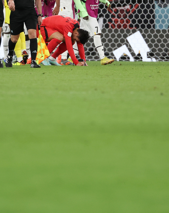 28일(한국시간) 오후 카타르 알 라얀의 에듀케이션시티 스타디움에서 열린 2022 카타르 월드컵 조별리그 H조 2차전 대한민국과 가나의 경기가 2-3으로 종료되자 손흥민이 고개를 숙인 채 아쉬워하고 있다. 연합뉴스