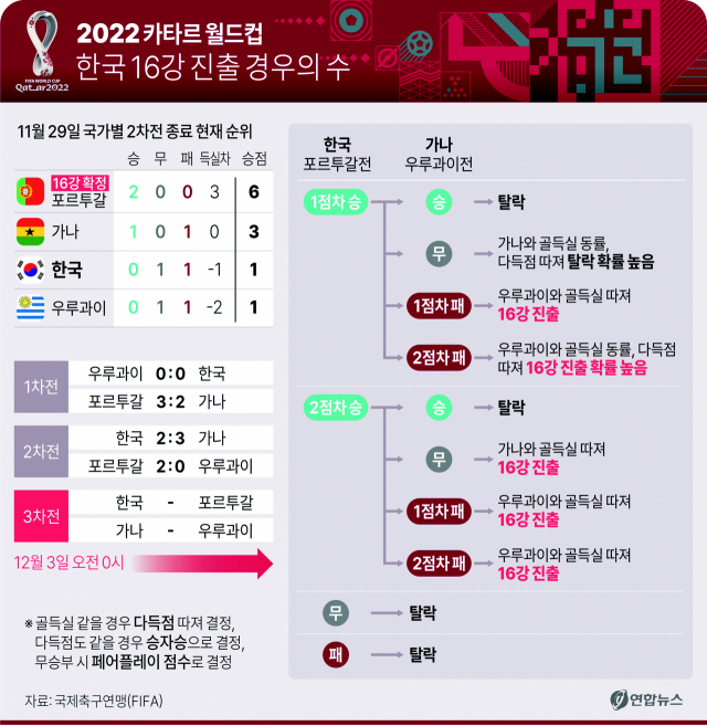 한국 축구 대표팀이 국제축구연맹(FIFA) 2022 카타르 월드컵 16강 진출을 위해 다시 한번 경우의 수를 따져 봐야 하는 처지에 놓였다. 한국은 조별 예선 마지막 경기인 포르투갈을 반드시 이기고, 우루과이와 가나의 경기 결과를 지켜봐야 한다. 2연승을 거둔 포르투갈은 프랑스, 브라질에 이어 참가국 32개국 세 번째로 16강 진출을 확정 지었다.