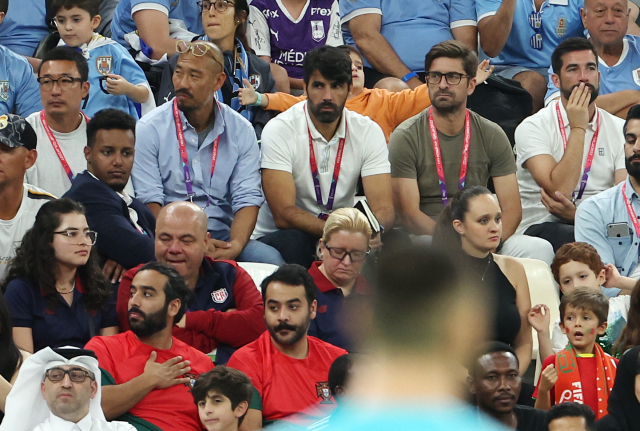 세르지우 코스타(뒷줄 오른쪽 두 번째) 수석코치 등 한국 축구 대표팀 코치진이 29일(한국시간) 오전 루사일 스타디움에서 열린 포르투갈-우루과이 경기를 지켜보며 포르투갈전 필승 전략을 구상하고 있다. 연합뉴스