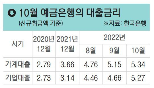 대기업 대출 금리는 5.08%로 0.70%P, 중소기업 대출 금리는 5.49%로 0.62%P 올랐다. 기업 대출과 가계대출 금리를 모두 반영한 예금은행의 전체 대출금리(가중평균·신규취급액 기준) 평균은 9월(4.71%)보다 0.55%P 높은 5.26%로 집계됐다.