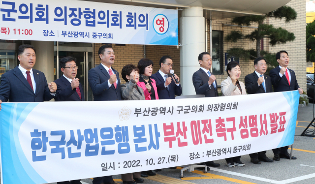 부산시 구·군의회 의장협의회가 최근 부산 중구청에서 산업은행 본사의 조속한 부산 이전을 촉구하는 성명을 발표하고 있다. 이재찬 기자 chan@