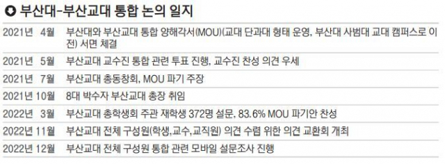 부산교대와 부산대는 2017년 대학 통합 논의의 물꼬를 텄다. 2018년에는 전호환 전 부산대 총장이 두 대학 공동발전 필요성을 주제로 부산교대에서 특강을 했으며, 2019년까지 양 대학 처장단 정례회의를 통해 교류협력 증진과 공동발전 방안이 논의됐다. 2019년 12월 부산대에서 부산교대를 거제교육특화 캠퍼스로 발전시키는 방안이 거론되기도 했다.