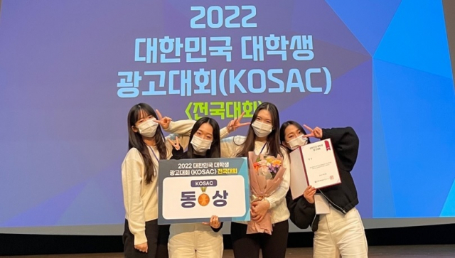 동아대 미디어커뮤니케이션과 ‘패밀리가 떴다’팀(2학년 박채아, 변제영, 윤정윤, 정승현)이 지난달 30일 동국대에서 열린 ‘2022 대한민국 대학생 광고대회(KOSAC) 전국대회’에서 동상을 수상했다. 전국 15개 대학팀과 경쟁 프레젠테이션을 펼친 ‘패밀리가 떴다’ 팀은 상금과 국내 대표 광고회사 인턴십 체험 기회를 얻었다.