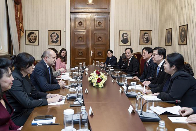 박형준 부산시장이 지난달 30일 불가리아 대통령궁에서 루멘 라데프 대통령과 회담하고 2030부산세계박람회 지지를 요청했다. 부산시 제공