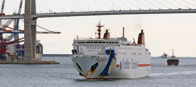 코로나19로 끊겼던 한-일 해상 여객항로가 정상화됐다. 1일 국적 여객선 팬스타 드림호가 900여 일 만에 일본 오사카항에서 여객 120여 명을 태우고 부산항 국제여객터미널에 입항하고 있다.