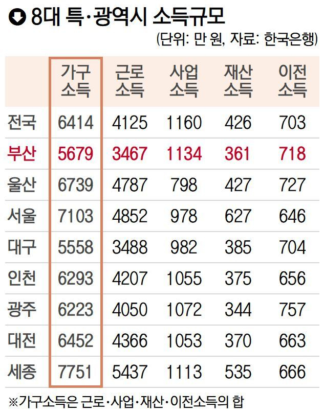 부산은 가구 연소득이 5679만 원으로 8대 특별시·광역시 중에서 대구(5558만 원)에 이어 두 번째로 낮았다. 전통적으로 소득이 높은 도시로 알려진 울산은 6739만 원이어서 세 번째로 높았다. 소득이 가장 높은 세종은 7751만 원으로 집계됐다. 2위는 서울로 7103만 원이었다.