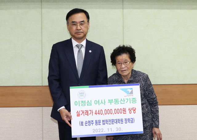부산대학교(총장 차정인)는 최근 부산대 법학과 90학번 故 손영주 동문의 어머니인 이정심(79) 여사가 아들이 공부했던 부산대 법학전문대학원의 학생들을 위한 장학금으로 써달라며 부산 해운대구에 소재한 4억 4000만 원(실거래가) 상당의 아파트를 기증했다고 밝혔다.