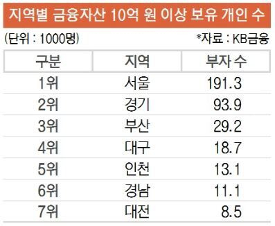 부자를 자산 규모별로 나눠보면, 부자의 90.7%(38만 5000명)가 '10억∼100억 원미만'의 금융자산을 보유한 '자산가'로 분류됐다. 보유 금융자산이 '100억∼300억 원미만'인 '고자산가'는 7.3%(3만 1000명), 300억 원 이상의 금융자산을 가진 '초고자산가'는 2.0%(9000명)를 차지했다.