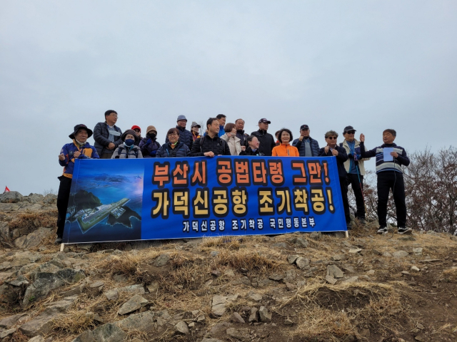 가덕신공항 유치를 위해 대 시민활동을 펼쳤던 ‘가덕신공항 국민행동본부’ (공동대표 류정호·남언욱) 소속 회원들이 3일 가덕신공항 부지에 있는 연대봉에 올라 가덕신공항의 공법논란을 지적하고 조속한 착공을 촉구했다.