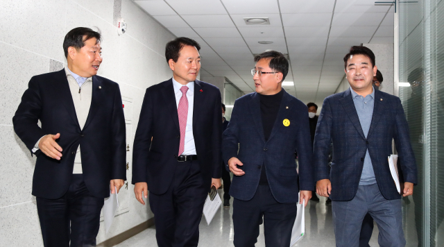 여야 정책위의장과 예산결산특별위원회 간사들이 4일 열린 ‘여야 2+2 예산안 협의’에서 발언을 마친 뒤 비공개 회의를 위해 이동하고 있다. 왼쪽부터 국민의힘 이철규 예결위 간사, 성일종 정책위의장, 더불어민주당 김성환 정책위의장, 박정 예결위 간사.