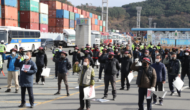 화물연대 파업 11일째인 4일 오후 부산 남구 부산항 신선대부두 앞에서 노조원들이 집회를 갖고 있다. 강선배 기자 ksun@